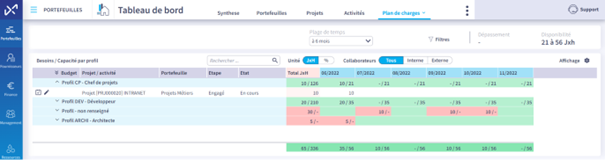 - On approfondira ensuite l’analyse avec le plan de charge: chaque collaborateur bénéficie d’une vision claire de sa charge, les managers une vue d’ensemble de leur équipe et le DSI et le PMO une perspective globale des besoins par profils pour anticiper les compétences nécessaires de demain.